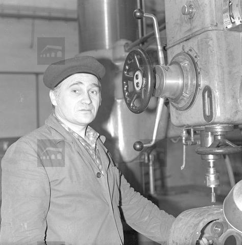 N/z jeden z pracowników wrocławskiej Fabryki Maszyn i Urządzeń Przemysłu Spożywczego "Spomasz" na hali produkcyjnej zakładu przy maszynie.