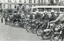 Uczestnicy zjazdu stojący pod pomnikiem Jana Husa w centralnej części rynku staromiejskiego. Maria Bigosińska klęczy (pierwsza z lewej) w pierwszym rzędzie.