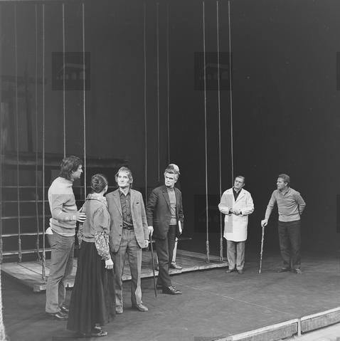 próba spektaklu "Czarownice z Salem" wg sztuki Arthura Millera w Teatrze Polskim we Wrocławiu przy ul. Gabrieli Zapolskiej 3; premiera spektaklu, wyreżyserowanego przez Zygmunta Hübnera, odbyła się 14.04.1973 r.; na zdjęciu trzeci od lewej Andrzej Polkowski, czwarty od lewej Piotr Kurowski, drugi od prawej Igor Przegrodzki