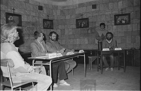 Wrocław, 03-06-1985. Kościół św. Wawrzyńca. ul. Bujwida. Spektakl pt. „Proces Władysława Frasyniuka” wystawiony przez aktorów Teatru Współczesnego we Wrocławiu, którzy odeszli z Teatru po zwolnieniu dyrektora Kazimierza Brauna. Wystąpili: Bogusław Kierc, Andrzej Makowiecki, Stanisław Melski, Andrzej Wilk, Kazimierz Wysota. Fot NAF Dementi