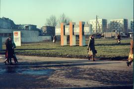 dekoracja z okazji VII Zjazdu PZPR [Warszawa, 8-12.12.1975 r.] w niezidentyfikowanym miejscu we wrocławskiej dzielnicy Śródmieście; za dekoracją widoczny przejeżdżający samochód Nysa 521 lub 522 [fotografia wykonana na zlecenie Komitetu Dzielnicowego PZPR Wrocław-Śródmieście];