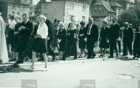 Procesja prymicyjna z domu rodzinnego ks. Alojzego Swobody do kościoła św. Marii Magdaleny w Radlinie (dziś Radlin II w granicach administracyjnych Wodzisławia Śląskiego). Z przodu idą rodzice ks. Swobody.