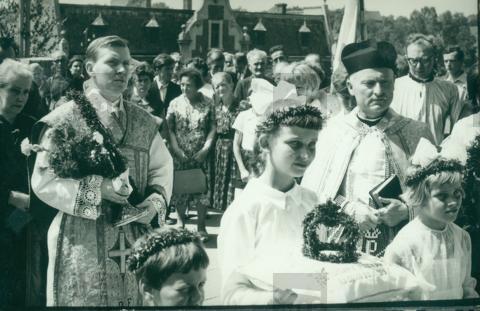 Początek mszy prymicyjnej ks. Alojzego Swobody (piąty od lewej) przed kościołem św. Marii Magdaleny w Radlinie (dziś Radlin II w granicach administracyjnych Wodzisławia Śląskiego). Pierwsza od lewej matka ks. Swobody.
