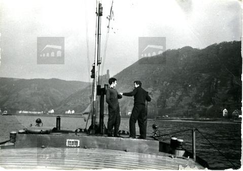 Stanisław Kwiecień na barkce motorowej typu BM-500, podczas rejsu po Renie w lecie 1971 roku.