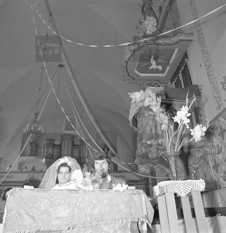 N/z młoda para przed Ołtarzem, za nimi organy kościelne w trakcie sakramentu małżeństwa w kościele pw św. Małgorzaty w Gajkowie.