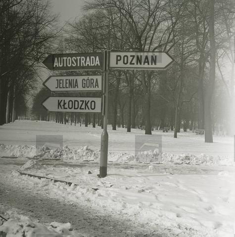 N/z skrzyżowanie ulic. Napisy na znakach drogowych: [Autostrada, Jelenia Góra, Kłodzko, Poznań]
