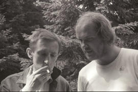 Granica PRL-CSRS, Kotlina Kłodzka, 09-07-1988. Spotkanie polskich i czeskich działaczy opozycji demokratycznej zorganizowane przez Solidarność Polsko-Czechosłowacka (SPCz). W spotkaniu wzięli udział: Piotr Niemczyk, Petr Uhl, Jan Ruml, Józef Pinior, Adam Michnik, Jan Lityński, Mieczysław Piotrowski, Jaroslav Sabata, Stanislav Devaty, Zbigniew Bujak, Anna Sabatova, ks. Vaclav Maly, Jan Carnogursky, Mirosław Jasiński, Zbigniew Romaszewski, Zbigniew Janas, Vaclav Havel, Petr Pospichal, Jan Urban, Danuta Winiarska, Jacek Kuroń, Ladislav Lis, Ivan Lamper i Sasa Vondra. N/z Jan Ruml i Józef Pinior. Fot. NAF Dementi