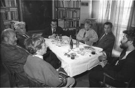 Wrocław, 03-11-1989 (do 05-11-1989) Międzynarodowe seminarium "Kultura na rozdrożu - pomiędzy totalitaryzmem a komercjalizmem" oraz Przegląd Czechosłowackiej Kultury Niezależnej.N/z jedno ze spotkań seminarium, od lewej: Frantisek Janouch, Jiri Pelikan, Ivana Tigridova, Karel Schwarzenberg, nn, nn, Mirosław Jasiński. Fot. NAF Dementi