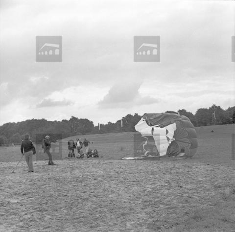 N/z lądowanie skoczka spadochronowego na polu zlotowym.