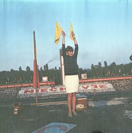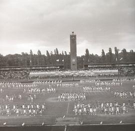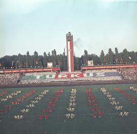 Uroczystość inaugurująca "Tydzień Sportu Szkolnego", połączona z rozgrywkami finałowymi Wojewódzkiej Spartakiady Młodzieży; kilkanaście tys. młodzieży oglądało barwne widowisko - m.in. na wieży zapłonął znicz, odczytano apel olimpijski, odbyły sie pokazy gimnastyczne przy żywej trybunie. N/z: fragment pokazu gimnastycznego na Stadionie Olimpijskim.