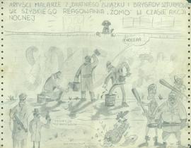 Niedokończony komiks o pacyfikacji zakładu przemysłowego przez siły milicji i ZOMO, na przedostatniej karcie rysunek radzieckiego generała, trzymającego za szyję wielką wronę w czarnych okularach i czapce wojskowej, mówiącego Wojtek tylko bez kawałów! Ma być 100%-owa frekwencja. Możliwe, że rysunek powstał około 1984 r, przy okazji wyborów do Rad Narodowych