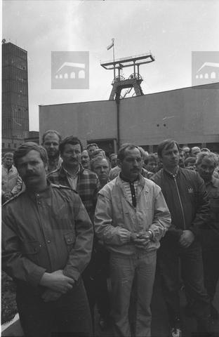Lubin, 07-05-1989. Kopalnia miedzi – Zakłady Górnicze Lubin, strajk okupacyjny. N/z msza św. dla strajkujących górników. Fot. NAF Dementi