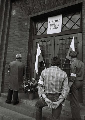 Poparcie dla protestów okazywali nie tylko mieszkańcy Wrocławia przychodzący w okolicę strajkujących zakładów. Na fasadach siedzib wielu instytucji - m.in. szpitali - pojawiły się transparenty z hasłami wsparcia. Na zdjęciu widoczne wejście do budynku Urzędu Pocztowego nr 1 przy ul. Krasińskiego z widocznym transparentem wyrażającym popracie dla strajku i kilkoma niezidentyfikowanymi osobami.