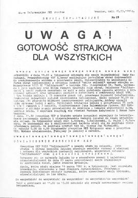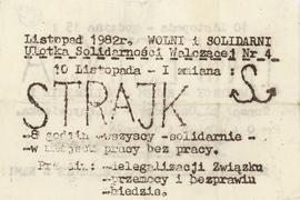 Wezwanie Miejskiego Komitetu Założycielskiego NSZZ Solidarność we Wrocławiu do 2-godzinnego strajku ostrzegawczego 12.02.1981 w związku z działaniami rządu PRL odmawiającego rejestracji chłopskiego niezależnego związku zawodowego, uregulowań finansowych i prawnych dotyczących wolnych sobót, a także blokującemu "Solidarności" dostęp do mediów i wprowadzającego ograniczenia prawa do strajku; MKZ wyraża też poparcie dla strajkujących w Jeleniej Górze, domagających się usunięcia skompromitowanych przedstawicieli władz i przekazania na cele społeczne Domu Wczasowego KC PZPR "Granit" i sanatorium MSW; na odwrocie komunikat z 07.02.1981, w którym MKSy: głogowski, legnicki, lubiński, wałbrzyski, wrocławski i zielonogórski zapowiadają wysłanie delegacji do Jeleniej Góry, zwołują tamże posiedzenie Krajowej Komisji Porozumiewawczej na dzień następny i decydują o rozpoczęciu strajku ostrzegawczego 12.02.1981 w razie niepomyślnego zakończenia rozmów ze stroną rządową.; w imieniu MKS Głogów wystąpił Czesław Dobropolski, MKS Legnica - Jerzy Węglarz, MKS Lubin - Ryszard Sawicki, MKS Wałbrzych - Jerzy Szulc, MKZ Wrocław - Jerzy Piórkowski, MKS Zielona Góra - Maciej Ołtarzewski