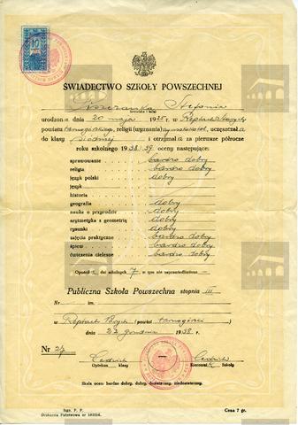 świadectwo Stefanii Piszki, uczennicy Publicznej Szkoły powszechnej stopnia III w Reptach Starych dziś dzielnica Tarnowskich Gór, za I półrocze roku szkolnego 1938/1939