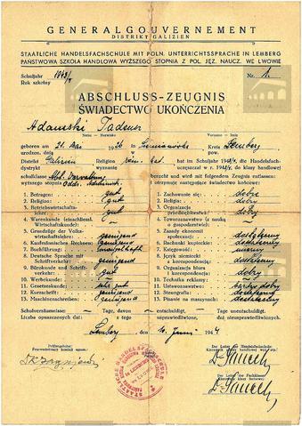 Świadectwo ukończenia Państwowej Szkoły Handlowej Wyższego Stopnia we Lwowie przez Tadeusza Adamskiego. Wystawione 10 czerwca 1944 r.