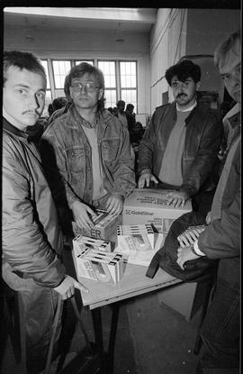 Wrocław, 09-1989. Hala Ludowa. Giełda komputerów i sprzętu audio-wideo. N/z sprzedawca kaset wideo. Fot. NAF Dementi