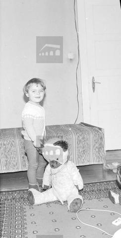 N/z dziecko stojące obok łóżka z pluszowym misiem.