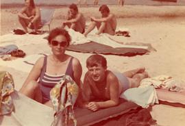 Grupa turystów pozująca do fotografii na Szczelińcu Wielkim [najwyższy szczyt Gór Stołowych, 919 m.n.p.m.], wśród nich obecny jest Mieczysław Piotrowski z matką (pierwsi z lewej). W tle widoczna jest forma skalna o nazwie Mamut (lub Małpolud).