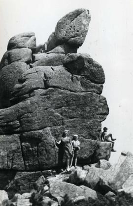 Mieczysław Piotrowski z matką na jednym z tarasów na Szczelińcu Wielkim [najwyższy szczyt Gór Stołowych, 919 m.n.p.m.].