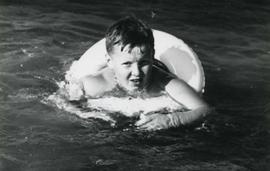 Mieczysław Piotrowski pływający w kole ratunkowym w morzu.