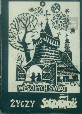 Bożonarodzeniowa kartka pocztowa z wizerunkiem świątyni Wang (?); oryginalny linoryt wykonany przez zespół Jana Cebrata w składzie: Jan Cebrat, Alicja Błaszczak, Zofia Kobierzyńska-Gołąb, Wiesława Szczepaniak, Bożena Zelent działający przy Akademii Rolniczej.