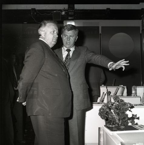 N/z sekretarz KC PZPR Stefan Olszowski i dyrektor zakładu Karol Popiel na wystawie sprzętu produkowanego przez zakłady Predom-Polar, sala domu kultury Polaru.