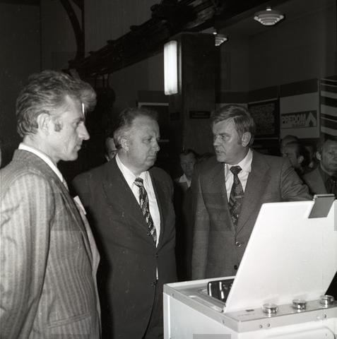 N/z delegacja partyjna na wystawie sprzętu produkowanego przez zakłady Predom-Polar, sala domu kultury Polaru. Na pierwszym planie pralka P-565, po lewej stoi dyrektor zakładu Karol Popiel, obok niego Stefan Olszowski, sekretarz KC PZPR.