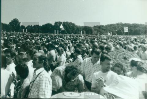 [Zdjęcie przedstawia tłumy z transparentami na mszy odprawianej przez Papieża na wrocławskim hipodromie.]