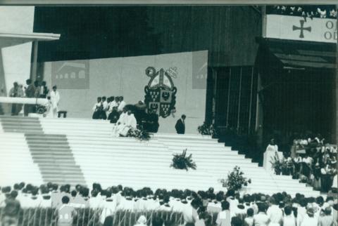 [Zdjęcie przedstawia część ołtarza i miejsca gości podczas mszy odprawianej przez Papieża na wrocławskim hipodromie.]