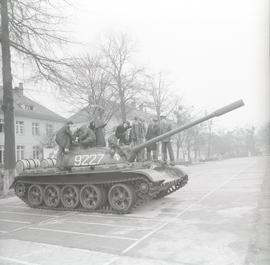 Dzień Otwartych Koszar w Wyższej Szkole Oficerskiej Wojsk Zmechanizowanych im. Tadeusza Kościuszki we Wrocławiu (obecnie Wyższa Szkoła Oficerska Wojsk Lądowych im. gen. Tadeusza Kościuszki). N/z: zwiedzający szkołę uczniowie zapoznają się z wojskowym sprzętem, w tym również z czołgami i innymi wozami bojowymi