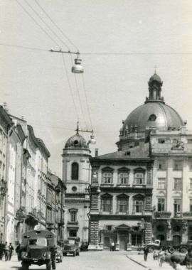 Widok na południowo-zachodni narożnik rynku. Od prawej znajdują się kamienice: Massarych [obecnie mieści się tam Lwowskie Muzeum Historyczne] oraz Szolc-Wolfowiczów [obecnie budynek mieszkalny]. Od lewej strony widoczne są kamienice: Dąbrowska [obecnie budynek mieszkalny] i Jelonkowska. Nad rynkiem góruje wieża Katedry Łacińskiej pw. Wniebowzięcia Najświętszej Marii Panny Kościoła Rzymskokatolickiego.
