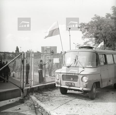 N/z samochód nysa 521 na tle ogrodzenia zajezdni autobusowej nr 7; flagi narodowe, za ogrodzeniem widoczny ołtarz polowy.