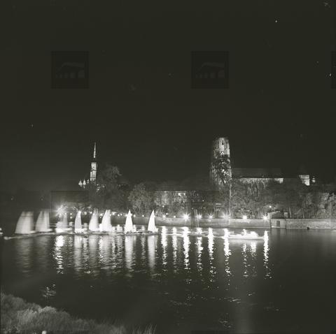 Zakończenie obchodów XXIII "Dni Wrocławia" (6-9 maja 1978 r.). N/z: parada żaglówek na tle oświetlonego Ostrowa Tumskiego (jako część widowiska plastyczno-muzycznego; przymocowane do żagli litery tworzyły napisy "Dni Wrocławia" oraz "Do zobaczenia za rok")