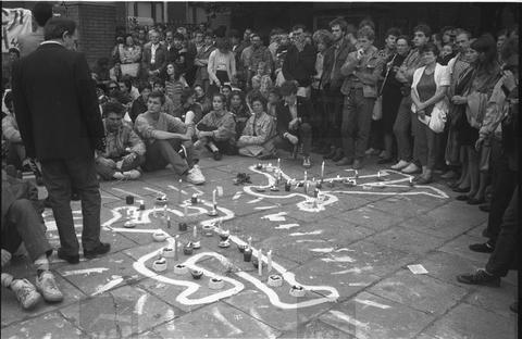 Warszawa, 07-06-1989. Ambasada Chińskiej Republiki Ludowej. Palenie zniczy i świec pamięci ofiar masakry na placu Tiananmen (Tian'anmen – plac Niebiańskiego Spokoju) w Pekinie 4 czerwca. Fot. NAF Dementi