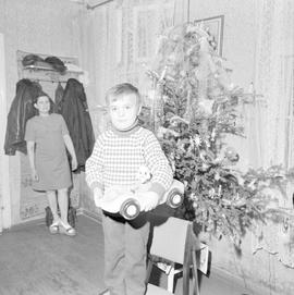 Kobieta trzymająca na rękach dziecko. Za nią choinka.