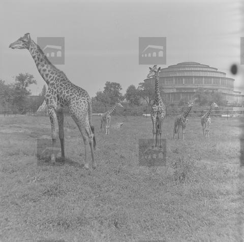 Żyrafy na swoim wybiegu we Wrocławskim Ogrodzie Zoologicznym w tle widoczny gmach Hali Ludowej.